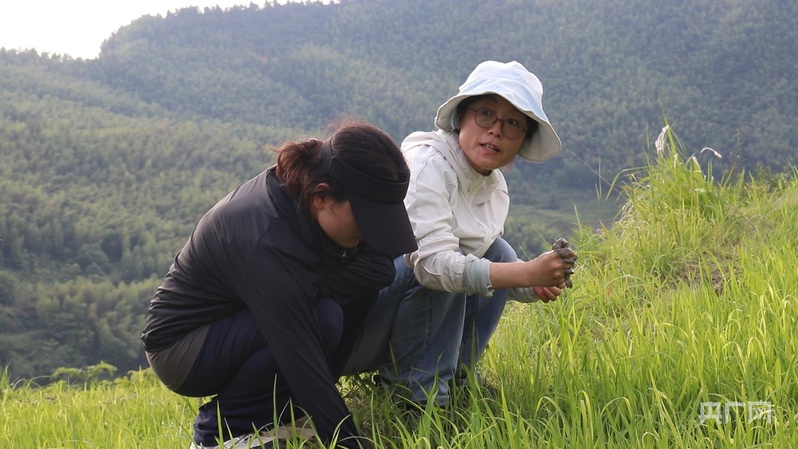 周文君(右)和助手一起觀察梯田土壤情況(央廣網(wǎng)記者 郇康新 攝)