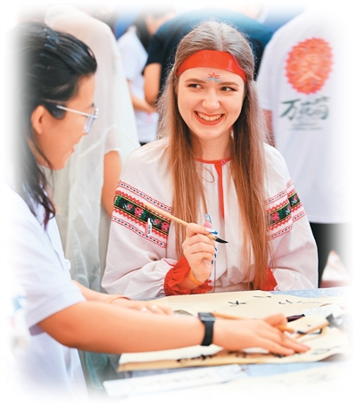 8月6日,“上合之約·絲路津彩”上合國(guó)家青年學(xué)生“萬(wàn)花筒”文化市集在天津舉行。圖為青年學(xué)生體驗(yàn)書法。