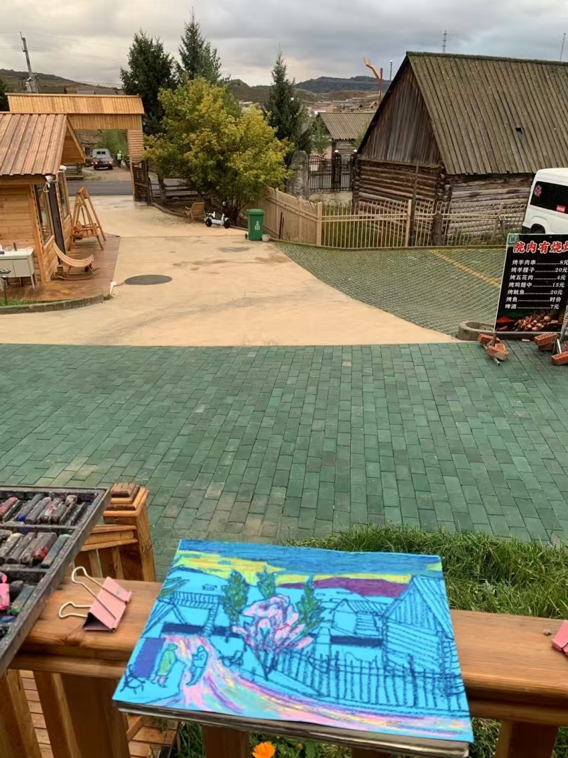 夕陽(yáng)西下,余暉為鐵熱克提鄉(xiāng)染上一層溫暖金色。正值“丹青墨彩助力鄉(xiāng)村振興”全國(guó)名家赴阿勒泰地區(qū)采風(fēng)寫生活動(dòng)在此開展,新疆畫院畫家徐江峰立于村頭,畫板上木屋錯(cuò)落、遠(yuǎn)山如黛,“這些木屋依地勢(shì)而建,高低起伏,極富節(jié)奏,是最入畫的題材。它們不僅體現(xiàn)人與自然的和諧,更承載著這片土地團(tuán)結(jié)向上的生活氣息?!?/p>