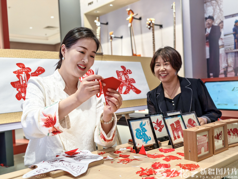 9月8日,剪紙藝人在巴州鑄牢中華民族共同體意識主題展館表演剪紙技藝。