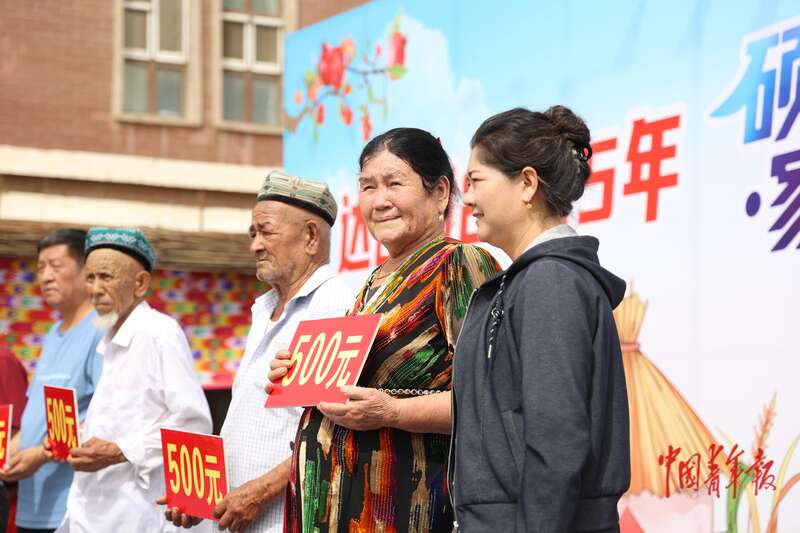 9月9日,新疆巴州尉犁縣興平鎮(zhèn)達(dá)西村,一場(chǎng)慶豐收活動(dòng)上,達(dá)西村黨委書記夏提古麗·熱合曼(右一)代表村集體向該村長者發(fā)放慰問金。通過棉花種植、文化旅游等,2024年達(dá)西村集體收入達(dá)230.55萬元。中青報(bào)·中青網(wǎng)記者 王鑫昕/攝