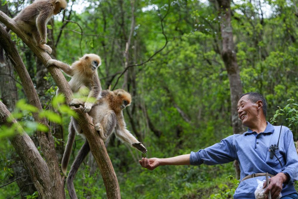 5月21日,巡護(hù)員徐庭友在巡護(hù)路上遇到幾只小川金絲猴,喂金絲猴吃花生。