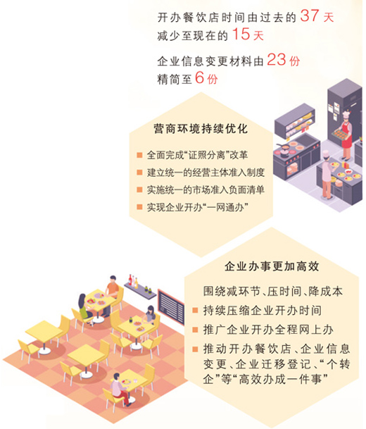 原先需要手動(dòng)填寫的信息變?yōu)橄到y(tǒng)智能生成,申請(qǐng)人只需勾選和核對(duì);表單的流轉(zhuǎn)從線下紙質(zhì)層層傳遞,變?yōu)橄到y(tǒng)上動(dòng)動(dòng)手指就可辦理……餐飲“一件事”改革后,營(yíng)業(yè)執(zhí)照實(shí)現(xiàn)了上午提交、下午出證,食品經(jīng)營(yíng)許可證辦理時(shí)間也從20個(gè)工作日縮短到三四天。