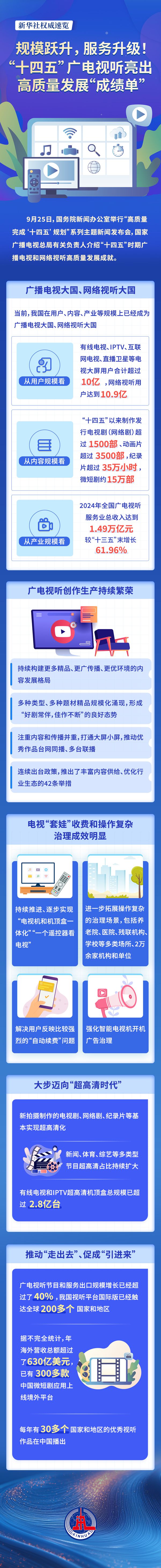 有線電視、IPTV、互聯(lián)網(wǎng)電視、直播衛(wèi)星等電視大屏用戶(hù)合計(jì)超過(guò)10億,網(wǎng)絡(luò)視聽(tīng)用戶(hù)達(dá)到10.9億;“十四五”以來(lái)制作發(fā)行電視劇(網(wǎng)絡(luò)?。┏?500部、動(dòng)畫(huà)片超3500部,紀(jì)錄片超35萬(wàn)小時(shí),微短劇約15萬(wàn)部;2024年全國(guó)廣電視聽(tīng)服務(wù)業(yè)總收入達(dá)到1.49萬(wàn)億元……