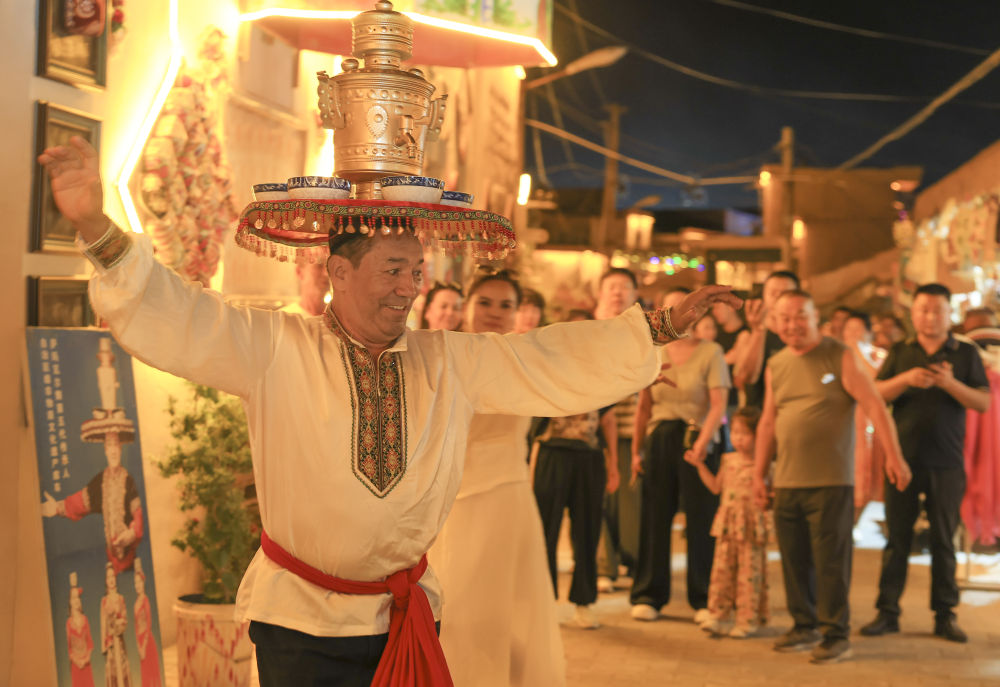 夜幕降臨,煙火氣息在庫車老城彌漫。廣場上傳來歡快的樂曲聲,舞者頭頂銅盤銅壺,腳步輕快,將迎賓之禮——薩瑪瓦爾舞展現(xiàn)在游客面前,掌聲與歡笑聲此起彼伏。