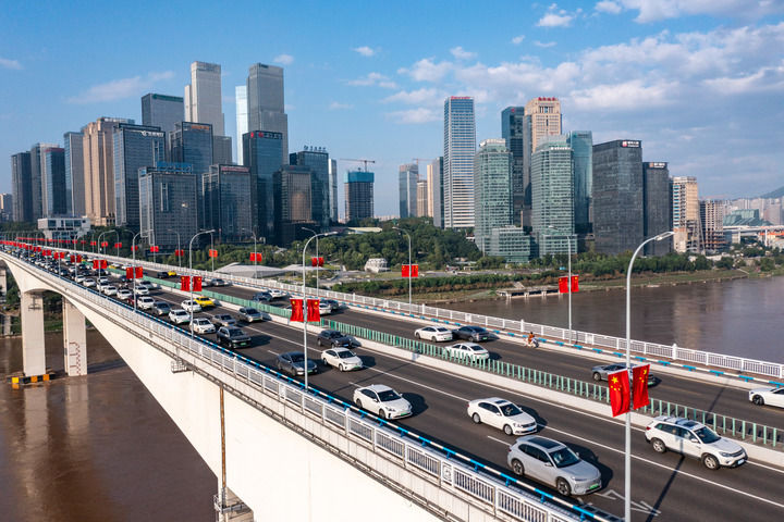 2025年10月1日,車輛行駛在掛滿國旗的重慶黃花園嘉陵江大橋上(無人機照片)。新華社記者 黃偉 攝