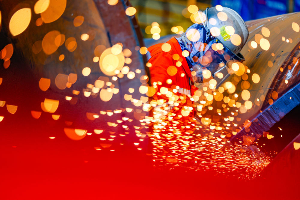 這是10月1日,在天津市濱海新區(qū),渤海油田工人進(jìn)行打磨作業(yè)。新華社發(fā)(杜鵬輝攝)