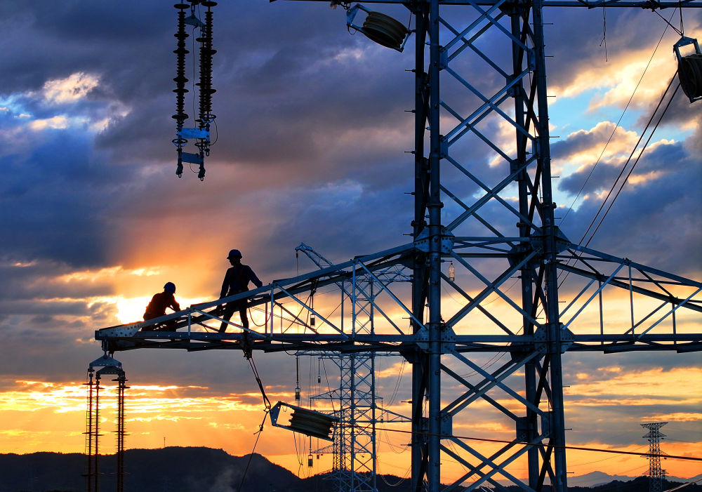 10月6日,在湖南省衡陽市雁峰區(qū),高塔架線工人在月光的映射下施工(無人機(jī)照片)。新華社發(fā)(曹正平攝)