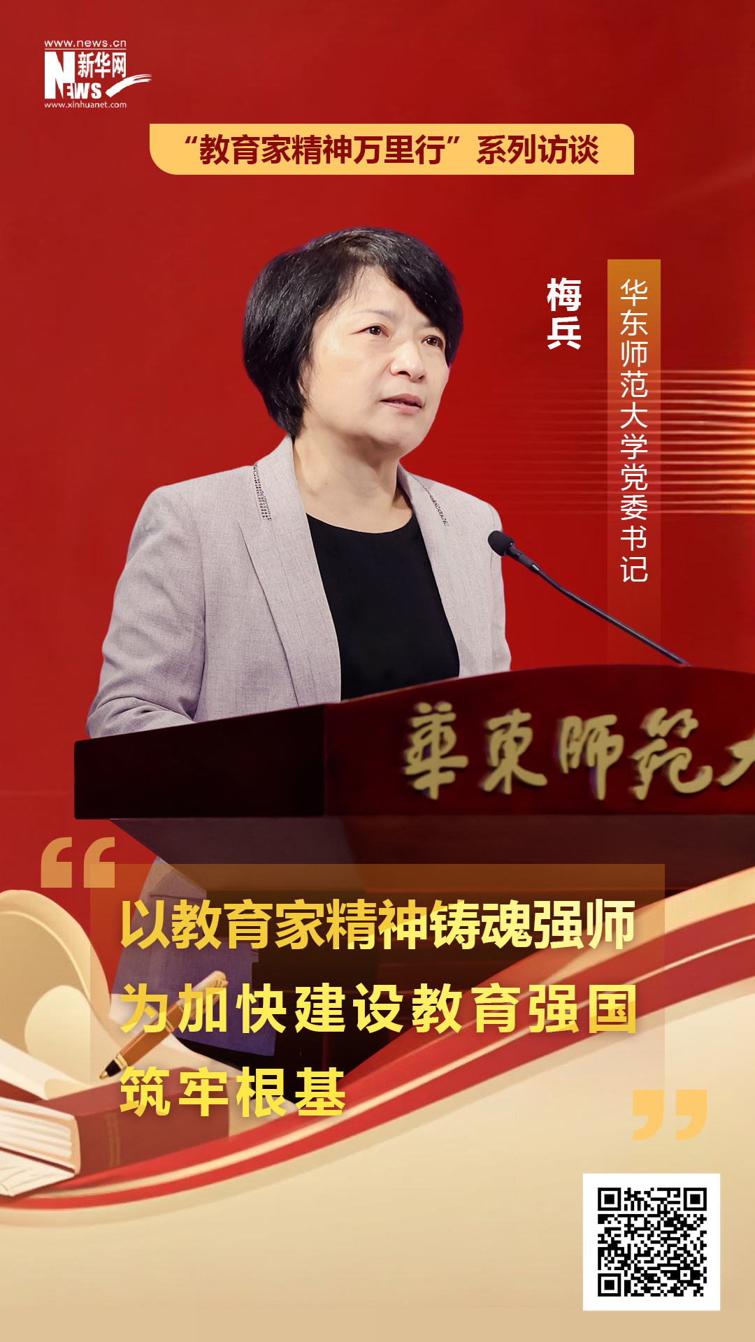 近日,華東師范大學黨委書記梅兵接受新華網(wǎng)專訪時,系統(tǒng)闡釋了實施教育家精神鑄魂強師行動對高校教師的新要求、學校弘揚教育家精神的創(chuàng)新舉措,以及高校筑牢教育家精神踐行主陣地、深化教師管理評價改革的路徑方向,為教育強國建設(shè)背景下的教師隊伍建設(shè)提供思路。