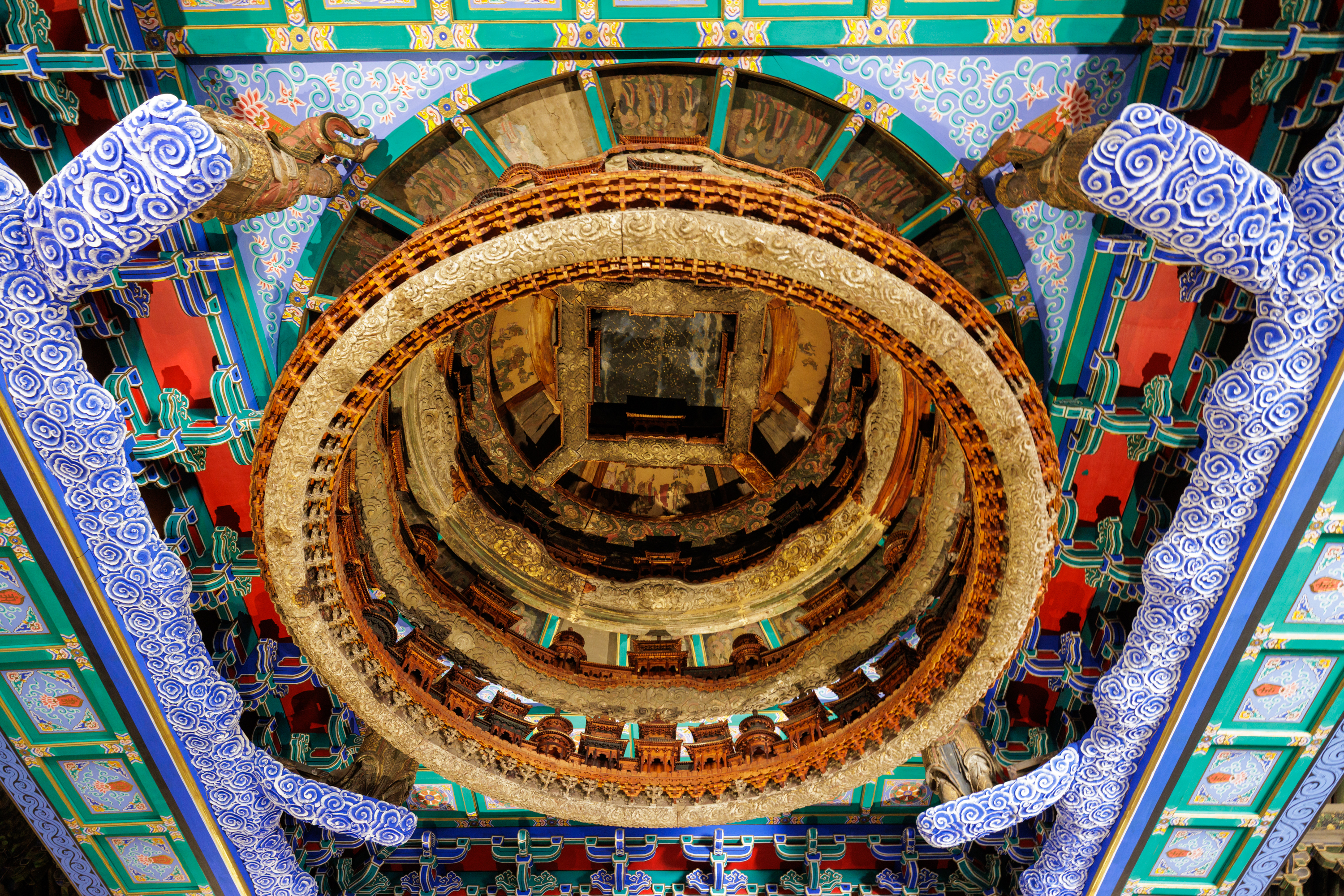 萬(wàn)善正覺殿天宮藻井是國(guó)家一級(jí)文物,原為北京隆福寺的建筑構(gòu)件,受1976年地震影響被拆成散件,后被運(yùn)到北京古代建筑博物館保存,經(jīng)過長(zhǎng)達(dá)5年的修復(fù)才基本恢復(fù)原貌,是北京古代建筑博物館的鎮(zhèn)館之寶。