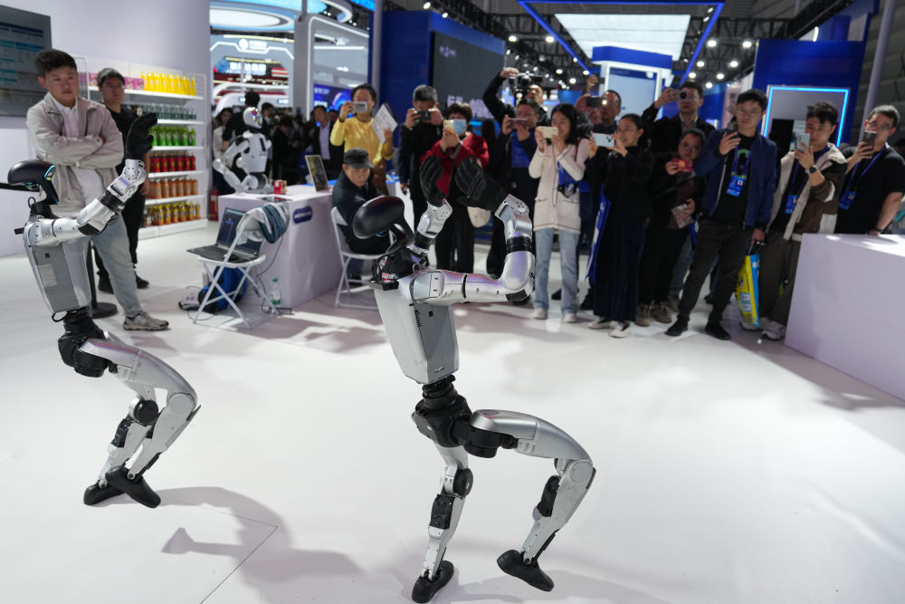 ↑ 11月6日,觀眾在2025年世界互聯(lián)網(wǎng)大會(huì)“互聯(lián)網(wǎng)之光”博覽會(huì)現(xiàn)場(chǎng)觀摩一家企業(yè)展示的人形機(jī)器人。新華社記者 黃宗治 攝