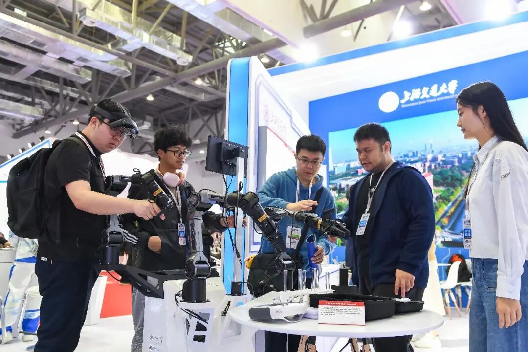 觀眾在第63屆高等教育博覽會(huì)上了解機(jī)械臂。新華社記者 張楠 攝