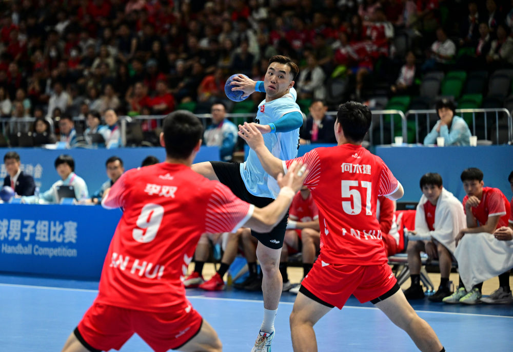 11月8日,在香港進行的第十五屆全國運動會男子手球半決賽中,香港隊球員連潤滔(中)在比賽中射門。新華社記者 于洋 攝
