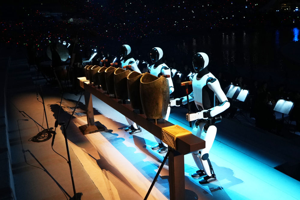 開幕式表演中的這一幕給觀眾留下深刻印象——三個工業(yè)人形機器人敲響千年前的中國古代樂器青銅句鑃,展開了一場未來與歷史的對話。談到此創(chuàng)意,十五運會開幕式藝術(shù)總監(jiān)陳維亞表示:“這一點我們很自信,抓得好、抓得精彩、抓得有特色?!?/p>