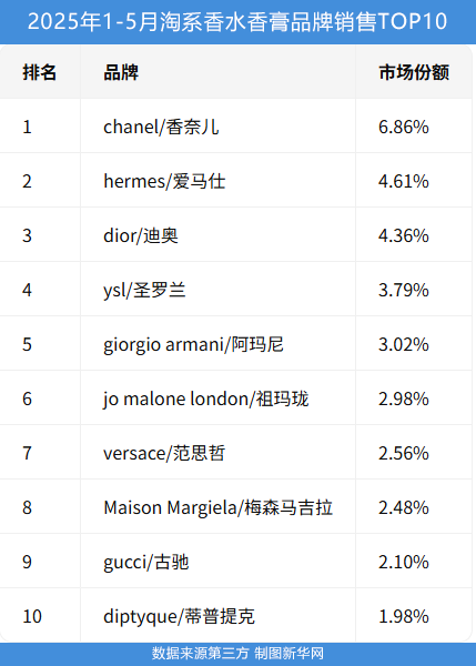 這一態(tài)勢在香水品類的重要銷售渠道淘系平臺(tái)(淘寶+天貓)的數(shù)據(jù)中也有所體現(xiàn)。國際大牌牢牢占據(jù)淘系平臺(tái)香水品牌銷售前十。數(shù)據(jù)顯示,2025年1-5月,榜單前十仍由香奈兒、圣羅蘭、祖瑪瓏等國際大牌壟斷。