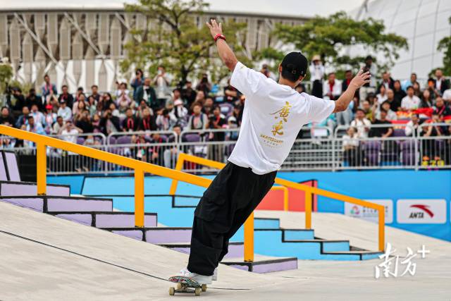 11月11日下午,十五運(yùn)會(huì)滑板項(xiàng)目男子街式?jīng)Q賽,廣東隊(duì)潘家杰完成高難度動(dòng)作后展開(kāi)雙臂與歡呼的觀眾們互動(dòng)。鄭新洽 攝