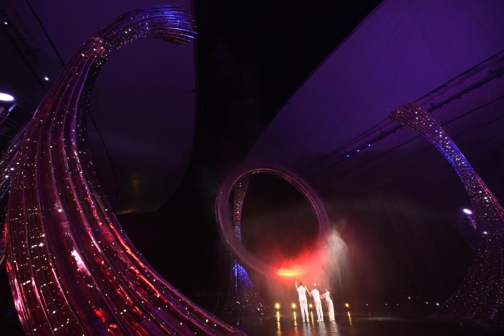 11月9日,火炬手蘇炳添(中)、張家朗(左)、李祎點(diǎn)燃主火炬。