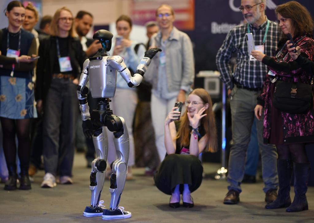 2025年11月12日,在葡萄牙里斯本,中國企業(yè)宇樹科技的人形機器人和與會者在2025年網(wǎng)絡(luò)峰會現(xiàn)場互動。新華社發(fā)
