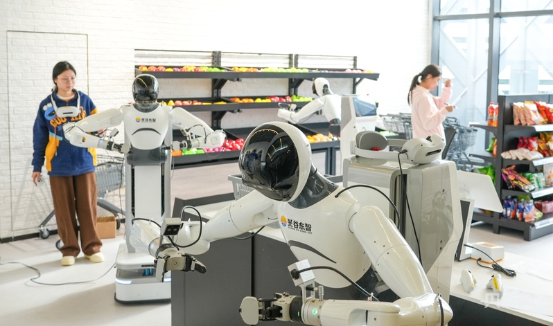 人形機器人在超市零售場景應(yīng)用訓練(央廣網(wǎng)記者鄧子依 攝)