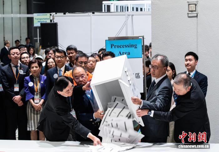 12月7日23時(shí)30分許,香港特區(qū)第八屆立法會(huì)選舉投票結(jié)束,隨即開(kāi)始點(diǎn)票工作。圖為香港特區(qū)政府政制及內(nèi)地事務(wù)局局長(zhǎng)曾國(guó)衛(wèi)(前排左二)、香港特區(qū)選舉管理委員會(huì)主席陸啟康(前排右二)等在位于香港會(huì)議展覽中心的中央點(diǎn)票站倒出選舉委員會(huì)界別投票箱中的選票?!≈行戮W(wǎng)記者 侯宇 攝