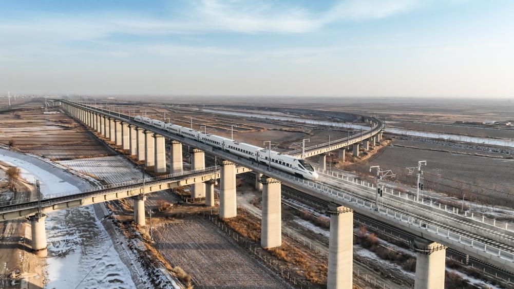 12月14日,一列試驗列車行駛在包銀高鐵線路上(無人機(jī)照片)。新華社發(fā)