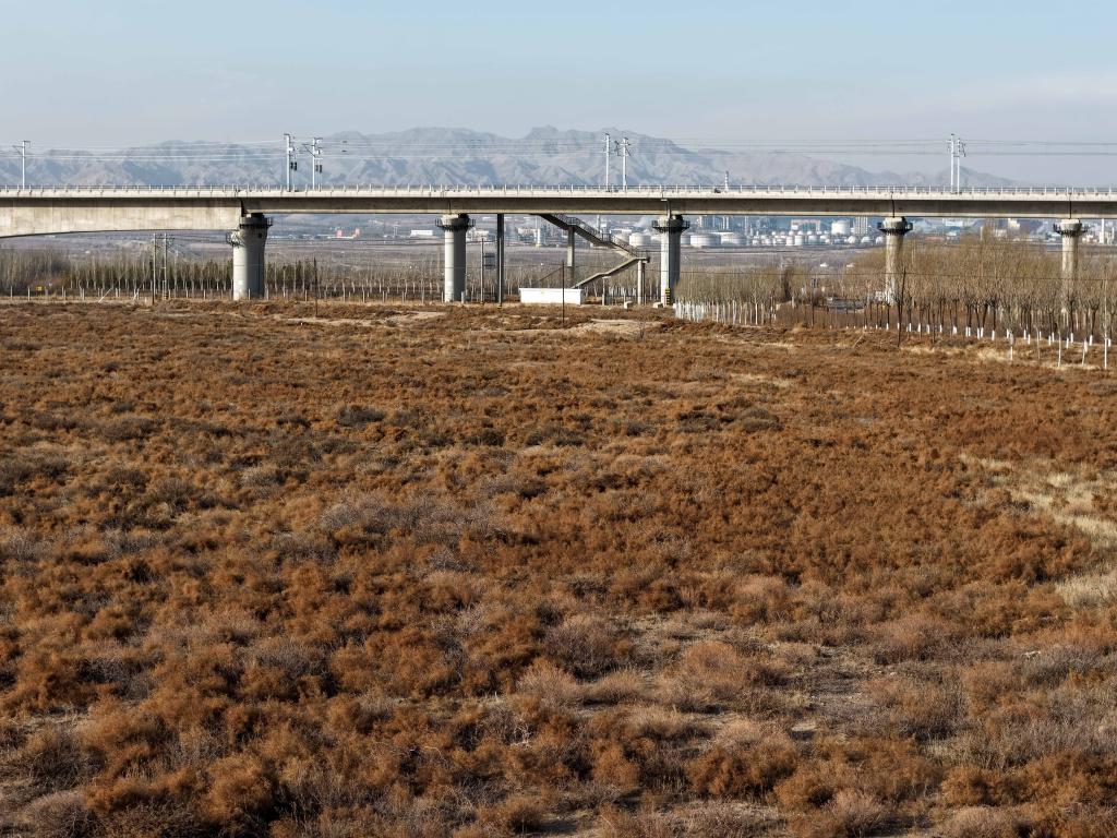 這是12月11日拍攝的包銀高鐵二道坎跨京藏高速特大橋,橋下是內(nèi)蒙古西鄂爾多斯國家級自然保護(hù)區(qū)烏海片區(qū)(無人機(jī)照片)。新華社記者 李志鵬 攝