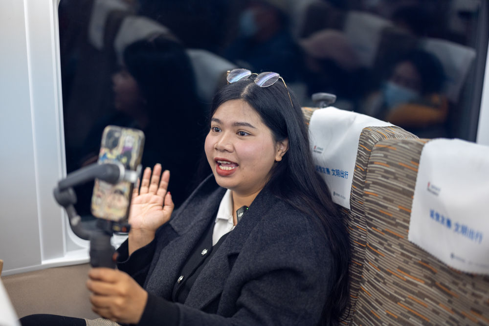 2025年2月21日,泰國(guó)博主李佩英在中國(guó)拍攝體驗(yàn)復(fù)興號(hào)高鐵列車(chē)。新華社記者 黃偉 攝