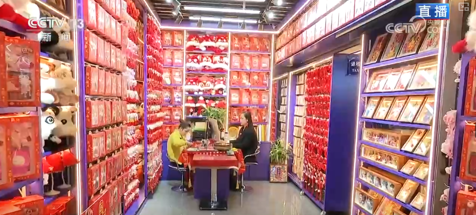 這里是商貿(mào)城的一區(qū),這家店鋪變化特別明顯,半年前記者來的時候,這里還擺滿了出口國外的節(jié)日用品。而現(xiàn)在,店里完全是另一番景象,放眼望去,滿滿的都是中國人自己過春節(jié)會用到的各種精美禮品和裝飾。