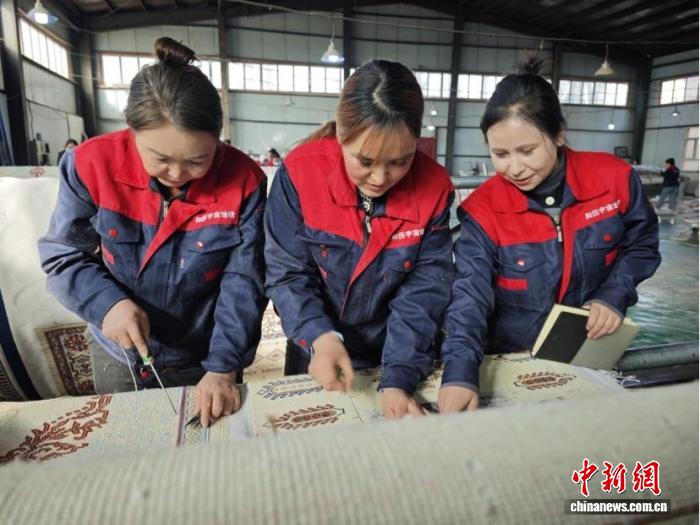 阿爾孜古麗(右一)在生產線上查看地毯編織流程工藝。閆兆霞 攝