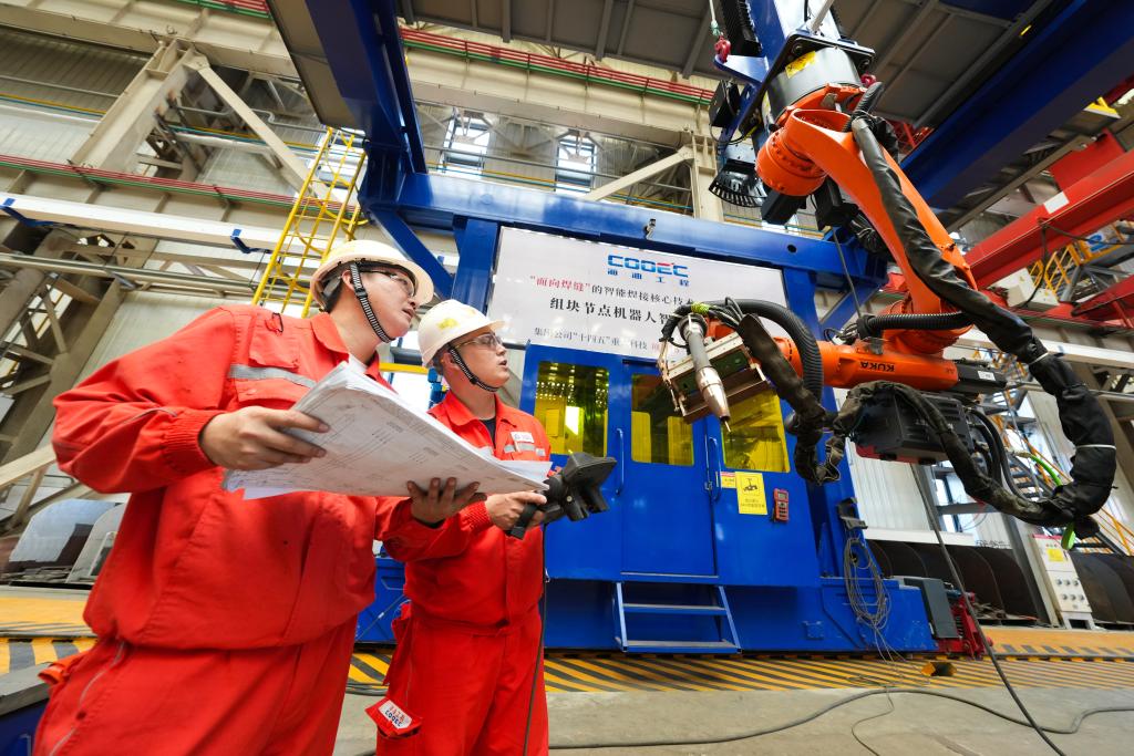 在海油工程天津智能制造基地,工程師正在調(diào)試設(shè)備。(海油工程供圖)