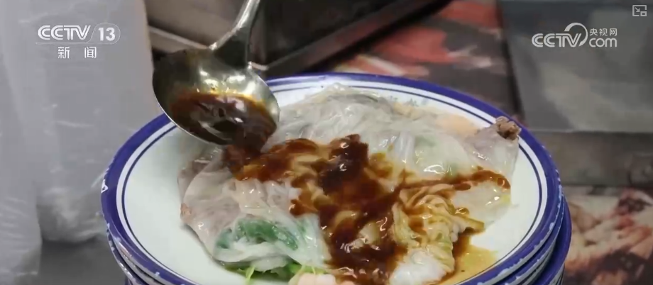 腸粉店老板陳軒豪介紹,米漿里水的比例也很關鍵,他們會根據當天的天氣進行調整,比如天氣炎熱潮濕的時候,就需要少放一點水,不然蒸出來口感就會比較軟爛。夏天還會放一些冰,防止米漿變質。