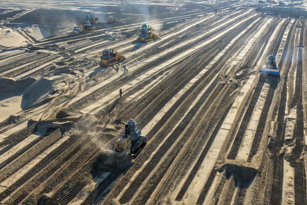隆冬時節(jié),塔克拉瑪干沙漠西南緣的新疆和田地區(qū)墨玉縣,治沙現(xiàn)場熱火朝天。數(shù)十臺推土機轟鳴著向沙漠腹地挺進,起伏的沙丘漸趨平整;不遠處,一束束干蘆葦被嵌入沙層,縱橫交錯的草方格如同堅實的“沙漠鎖扣”,牢牢鎖住流動黃沙。