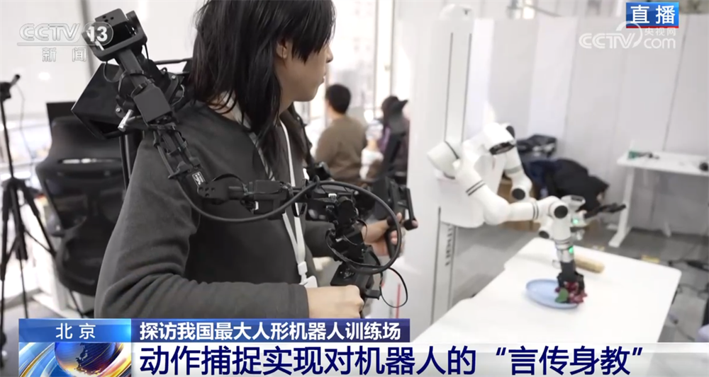 那您可能要問了,老師教學(xué)生講究一個“言傳身教”,那么,訓(xùn)練師和機器人之間是怎么交流的呢?您看,這位戴著VR眼鏡、拿著操作手柄的訓(xùn)練師就正在給這臺機器人上課。還有您看,當(dāng)訓(xùn)練師按操作鍵時,機器人的手臂可以移動、手指也會進(jìn)行抓取。還有的訓(xùn)練師會穿上布滿傳感器的動作捕捉衣,讓機器人可以在更精準(zhǔn)的數(shù)據(jù)指導(dǎo)下進(jìn)行訓(xùn)練。機器人就是在這些數(shù)據(jù)的傳輸中,一遍一遍模仿,反復(fù)練習(xí),從而提高每個動作的精準(zhǔn)度。