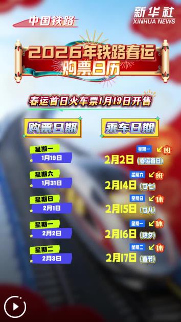 記者1月18日從中國(guó)國(guó)家鐵路集團(tuán)有限公司獲悉,2026年鐵路春運(yùn)自2月2日開始,至3月13日結(jié)束,為期40天,全國(guó)鐵路預(yù)計(jì)發(fā)送旅客5.39億人次,節(jié)前客流高峰日預(yù)計(jì)為2月13日(臘月廿六),節(jié)后客流高峰日預(yù)計(jì)為2月23日(正月初七),春運(yùn)首日火車票將于1月19日開始發(fā)售。