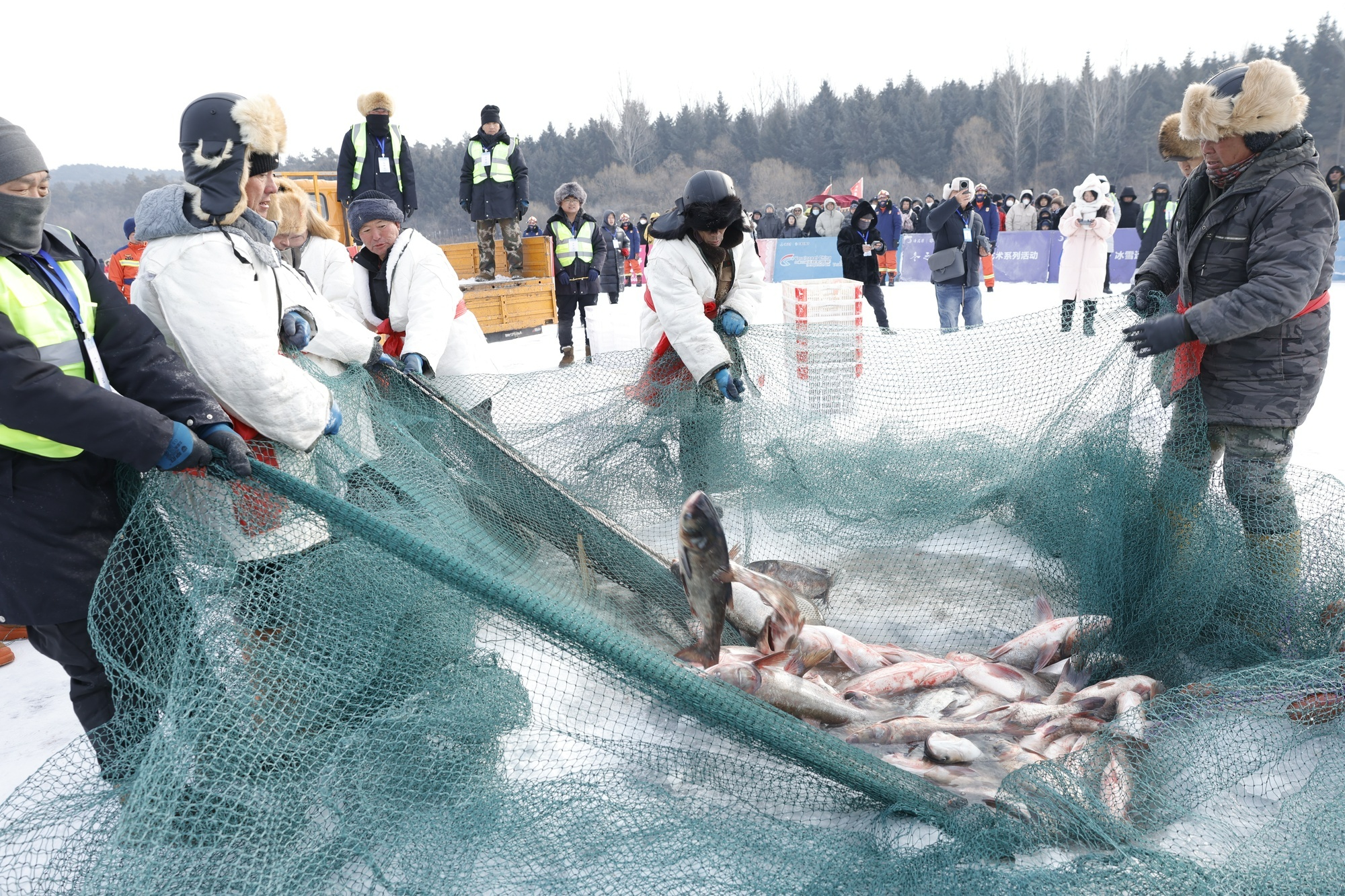 伴隨著“魚把頭”一聲令下,數萬條活魚躍出水面,“冰湖騰魚”的盛景瞬間點燃寒冬。