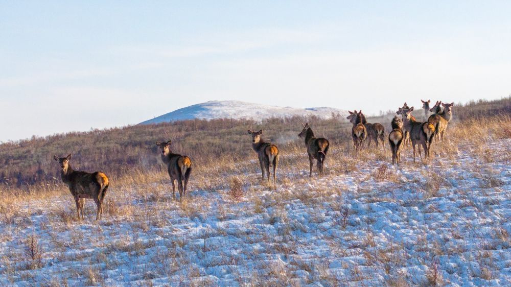 鹿群行走在山間,與白雪相映成趣