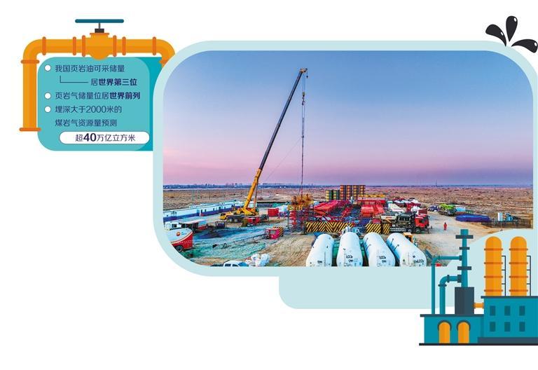 資源稟賦支撐戰(zhàn)略選擇。數(shù)據(jù)顯示,全球頁巖油儲量在11萬億噸至13萬億噸之間,頁巖氣資源量約為456萬億立方米,是當前世界常規(guī)天然氣探明總儲量的2倍以上。我國頁巖油可采儲量居世界第三位,頁巖氣儲量位居世界前列,埋深大于2000米的煤巖氣資源量預(yù)測超40萬億立方米。