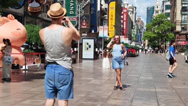 題圖來源:2025年夏天,外國游客在南京路步行街上留影。
