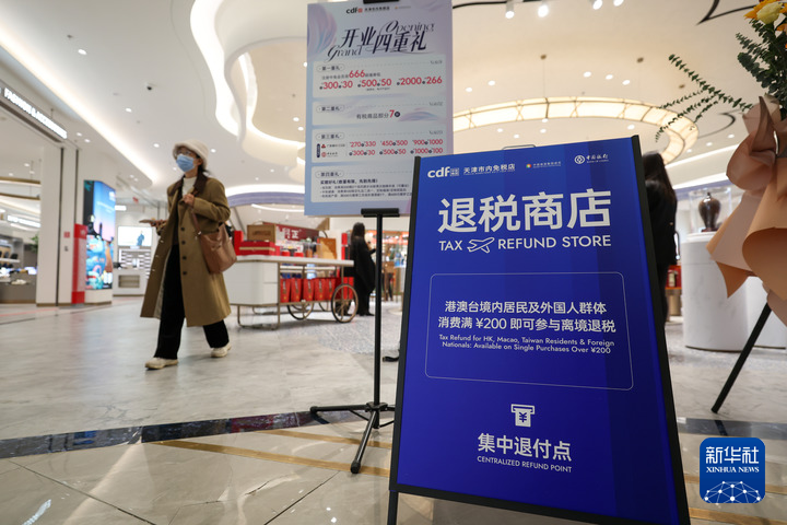 2025年11月28日在天津市內(nèi)免稅店拍攝的退稅商店集中退付點標牌。新華社記者 孫凡越 攝