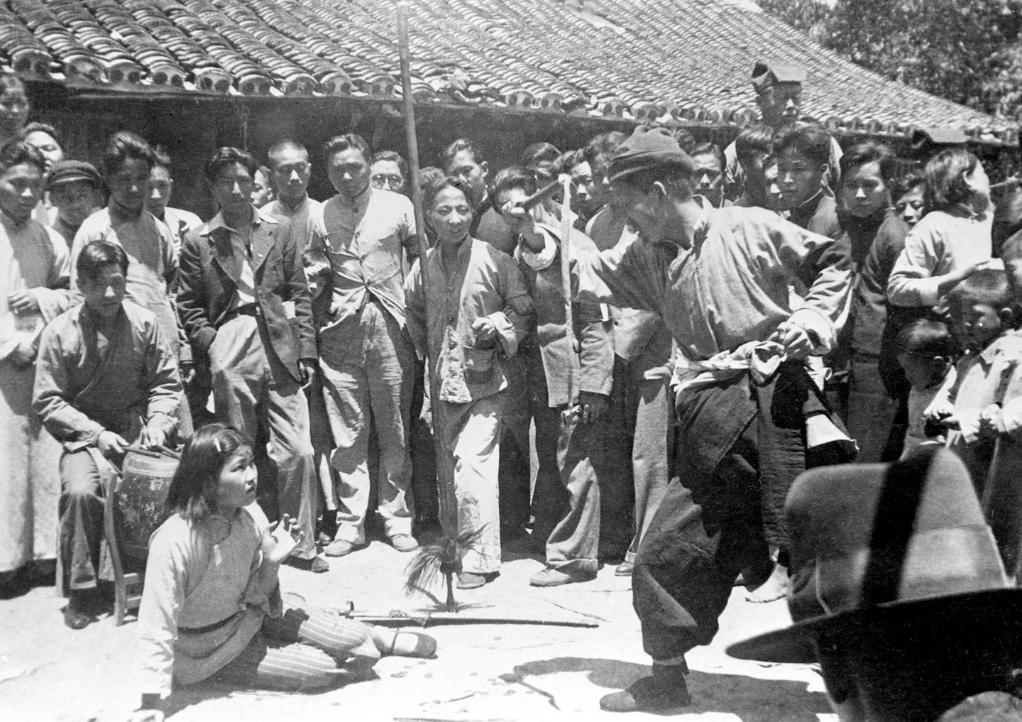 在國民黨統(tǒng)治區(qū),進步的文藝團體到農(nóng)村演出抗戰(zhàn)話劇《放下你的鞭子》。該劇是“國防戲劇”代表作。(新華社發(fā))