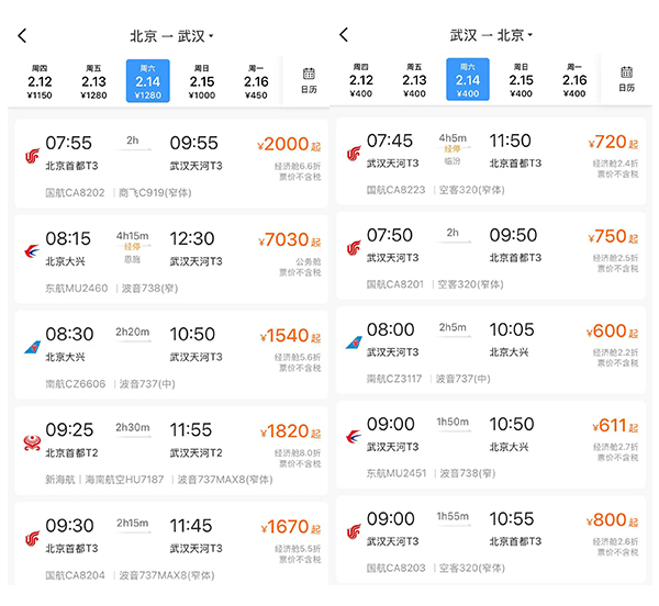 以1月30日價(jià)格為例,鐵路12306平臺(tái)顯示2月14日從北京到武漢的經(jīng)濟(jì)艙票價(jià)千元不等,而“反向出行”票價(jià)優(yōu)勢(shì)顯著。(圖片截取自鐵路12306客戶端)