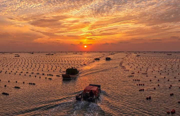 2025年10月24日,在山東省榮成市愛倫灣鮑魚養(yǎng)殖區(qū),收獲鮑魚的養(yǎng)殖戶駕駛船只返回漁港(無人機照片)。