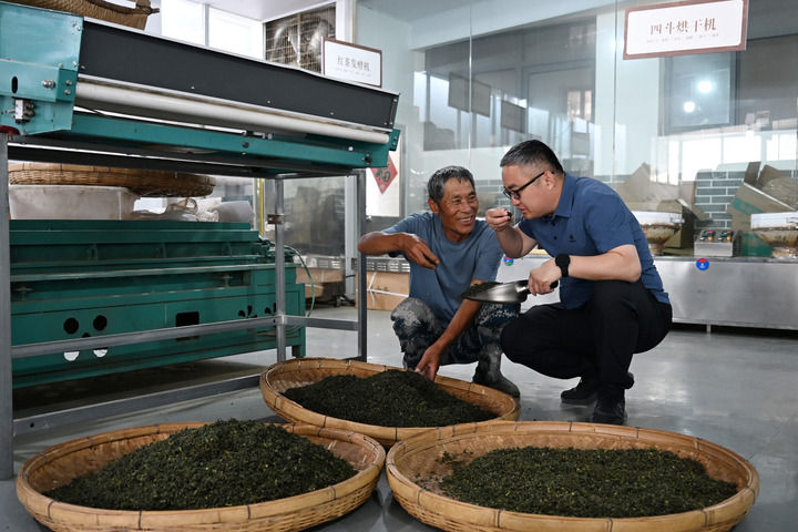 2025年5月25日,在山東省日照市五蓮縣丁家樓子村,第一書記鄭勇山(右)在村里的茶葉合作社查看茶葉品質。