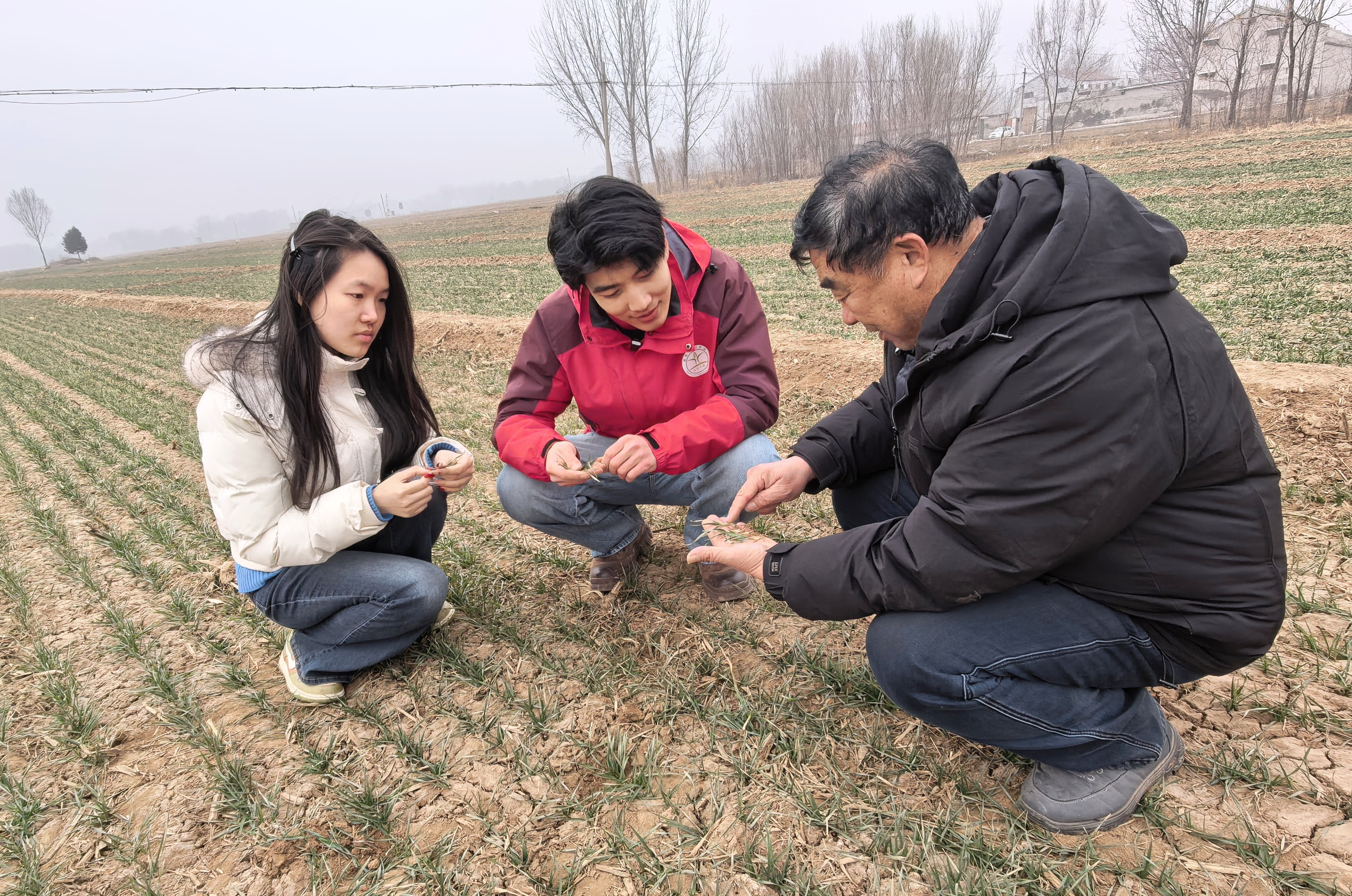 1月31日早上,中國(guó)農(nóng)業(yè)大學(xué)曲周實(shí)驗(yàn)站研究生李康寧、龔若魚和北油村種糧大戶呂桂生一起察看苗情。農(nóng)民日?qǐng)?bào)全媒體記者 李杰 攝