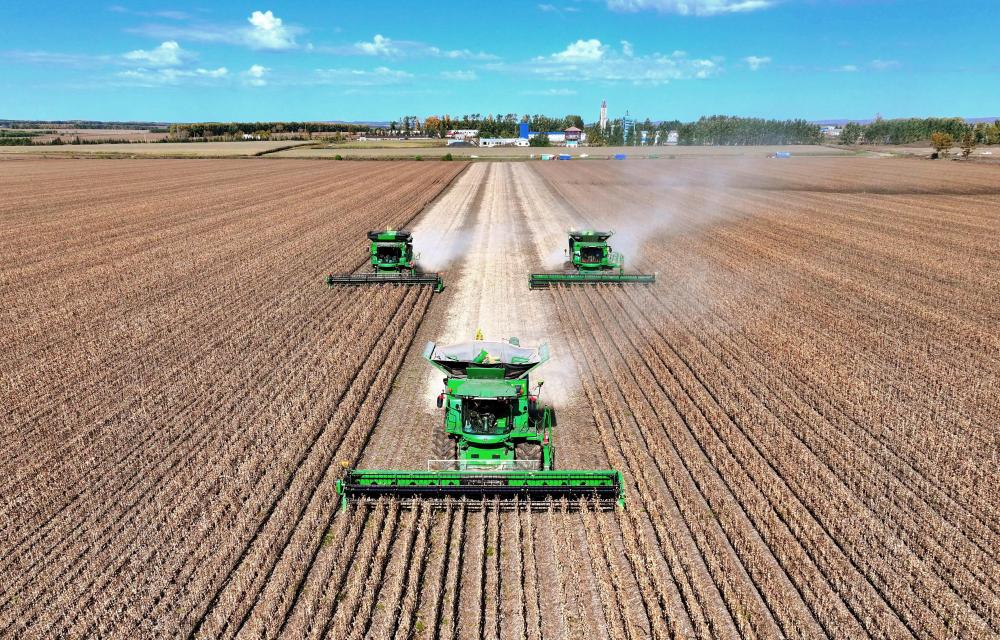2025年9月29日,在北大荒集團(tuán)黑龍江尾山農(nóng)場(chǎng)有限公司第一管理區(qū),農(nóng)機(jī)進(jìn)行大豆收獲作業(yè)(無(wú)人機(jī)照片)。新華社發(fā)(陸文祥攝)
