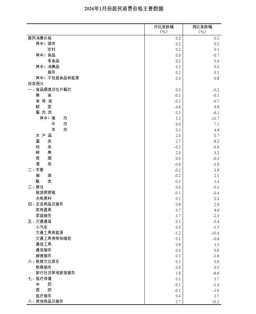 2026年1月份,全國(guó)居民消費(fèi)價(jià)格同比上漲0.2%。其中,城市上漲0.2%,農(nóng)村上漲0.1%;食品價(jià)格下降0.7%,非食品價(jià)格上漲0.4%;消費(fèi)品價(jià)格上漲0.3%,服務(wù)價(jià)格上漲0.1%。