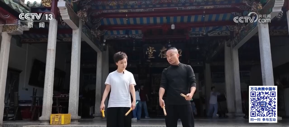 總臺(tái)記者趙宇昕找到了普寧富美青年英歌隊(duì)總教練李俊浩,趙宇昕說(shuō):“李教練,我是您失散多年的徒弟。我總是看您在英歌舞里面跳關(guān)勝那個(gè)角色,動(dòng)作非常鼓舞人心,今天特意找您學(xué)一學(xué)英歌舞。”