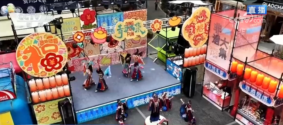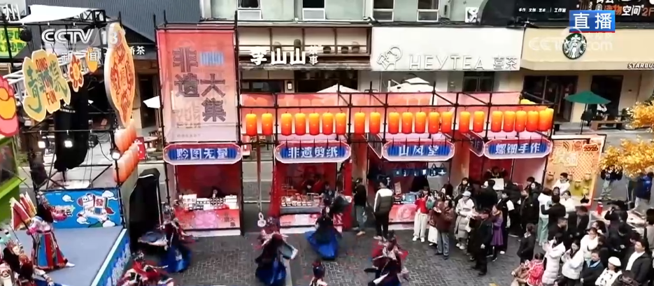 記者來(lái)到貴陽(yáng)市的青云市集,通過(guò)航拍鏡頭可以看到,這里是在貴陽(yáng)老城區(qū)的中心位置。最近幾年,貴陽(yáng)市通過(guò)城市更新,把這里改造成了火爆出圈的文旅街區(qū)?,F(xiàn)在,聽(tīng)見(jiàn)鼓聲響起,青云市集為了迎新春而專(zhuān)門(mén)打造的“非遺集市”正式開(kāi)市了,臺(tái)上正在表演的是貴州省級(jí)非物質(zhì)文化遺產(chǎn)——石阡儺戲。