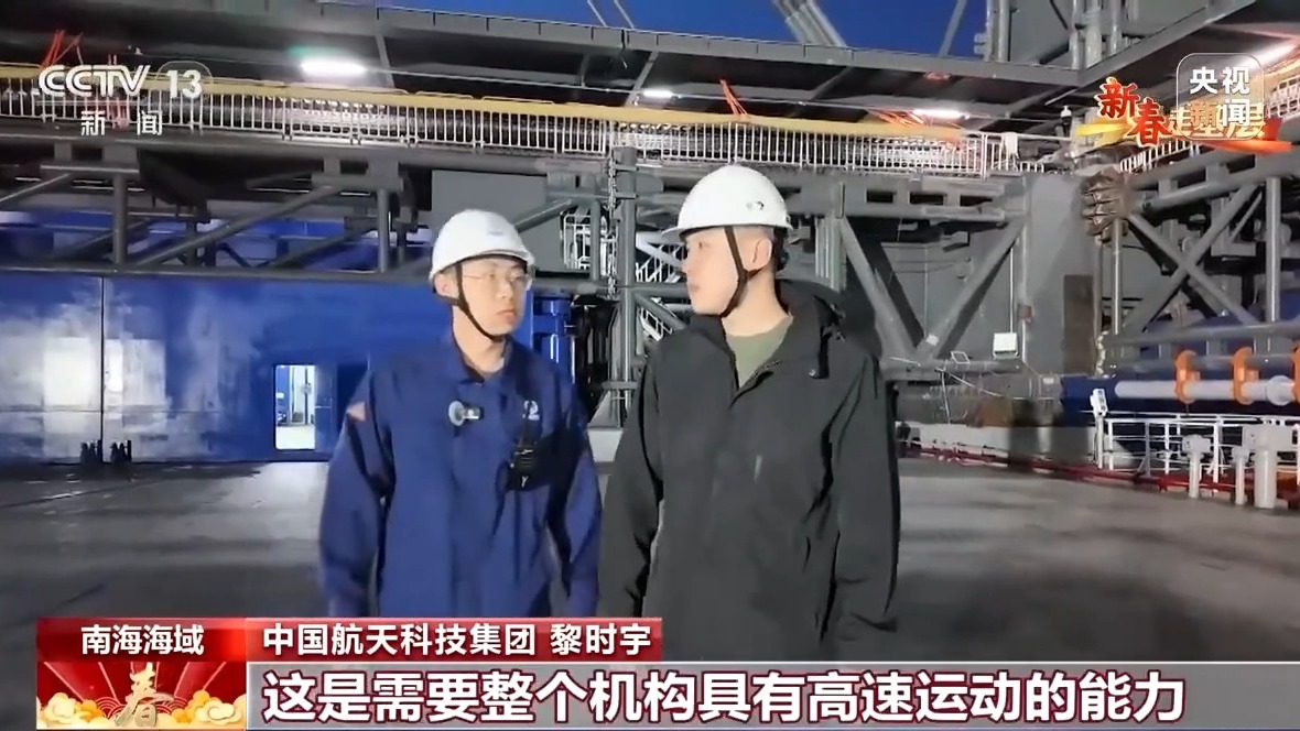 總臺記者 馬宇辰:“領(lǐng)航者”號海上回收平臺長144米,寬50米,滿載排水量超過2.5萬噸,是個名副其實(shí)的大家伙。但是發(fā)射塔架的高度接近70米,加上船體和天線,整體的高度接近30層樓高,所以它的重心是非常高的,再加上冬天的海況比較惡劣,我的感覺就是整個船體都在不規(guī)律地?fù)u晃著。