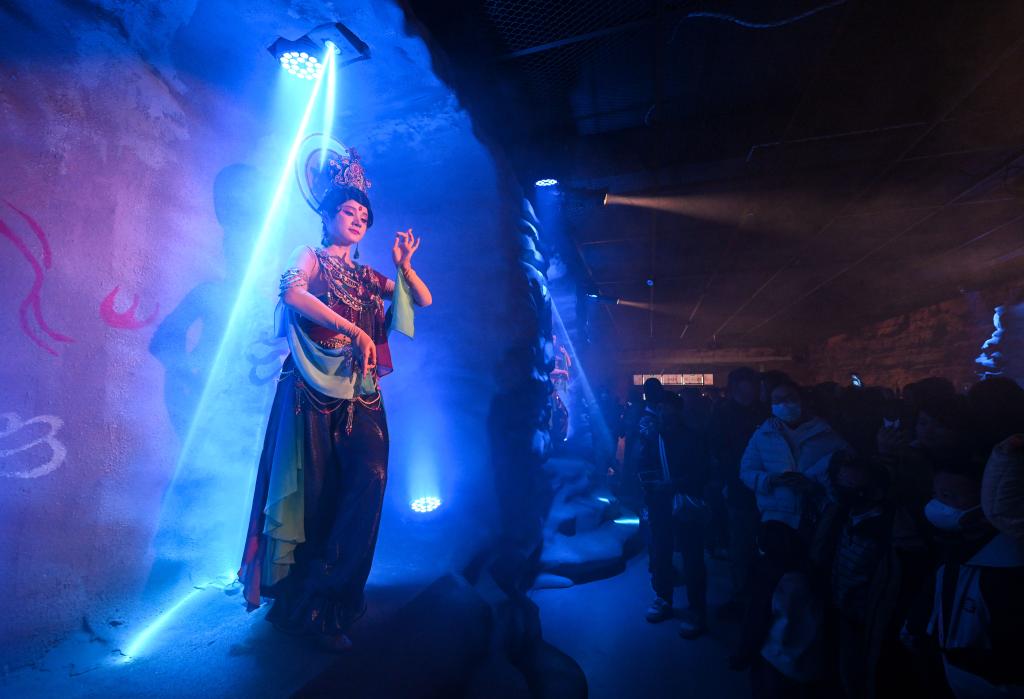 馬年春節(jié)期間,寧夏銀川市賀蘭山下格外熱鬧。走進(jìn)西夏陵博物館后數(shù)百米長(zhǎng)的廊道,游客仿佛穿越回千年前的西夏——身著各民族傳統(tǒng)服飾的“商賈”沿街叫賣,“麻魁”女兵英姿颯爽,西夏壁畫中的“飛天”在神秘?zé)熿F與燈光中翩躚起舞……